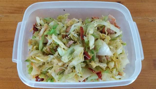 カルディで買ったドライトマトが余っていたので、刻んだキャベツをドライトマト、にんにく、鷹の爪、ベーコンを入れてオリーブで炒めました。