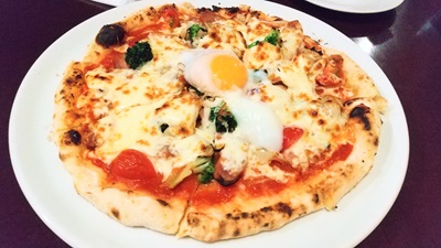 トッピングは、トマトソース、ロースハム、ブロッコリー、マッシュルーム、モッツアレラチーズ、温玉で具だくさん。